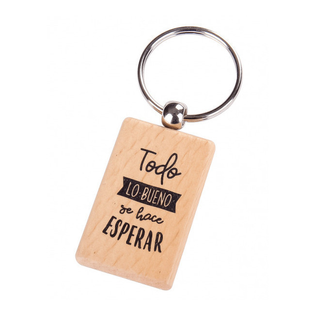 - Porta-chaves original em madeira com a frase "All Good Things come to those who wait".