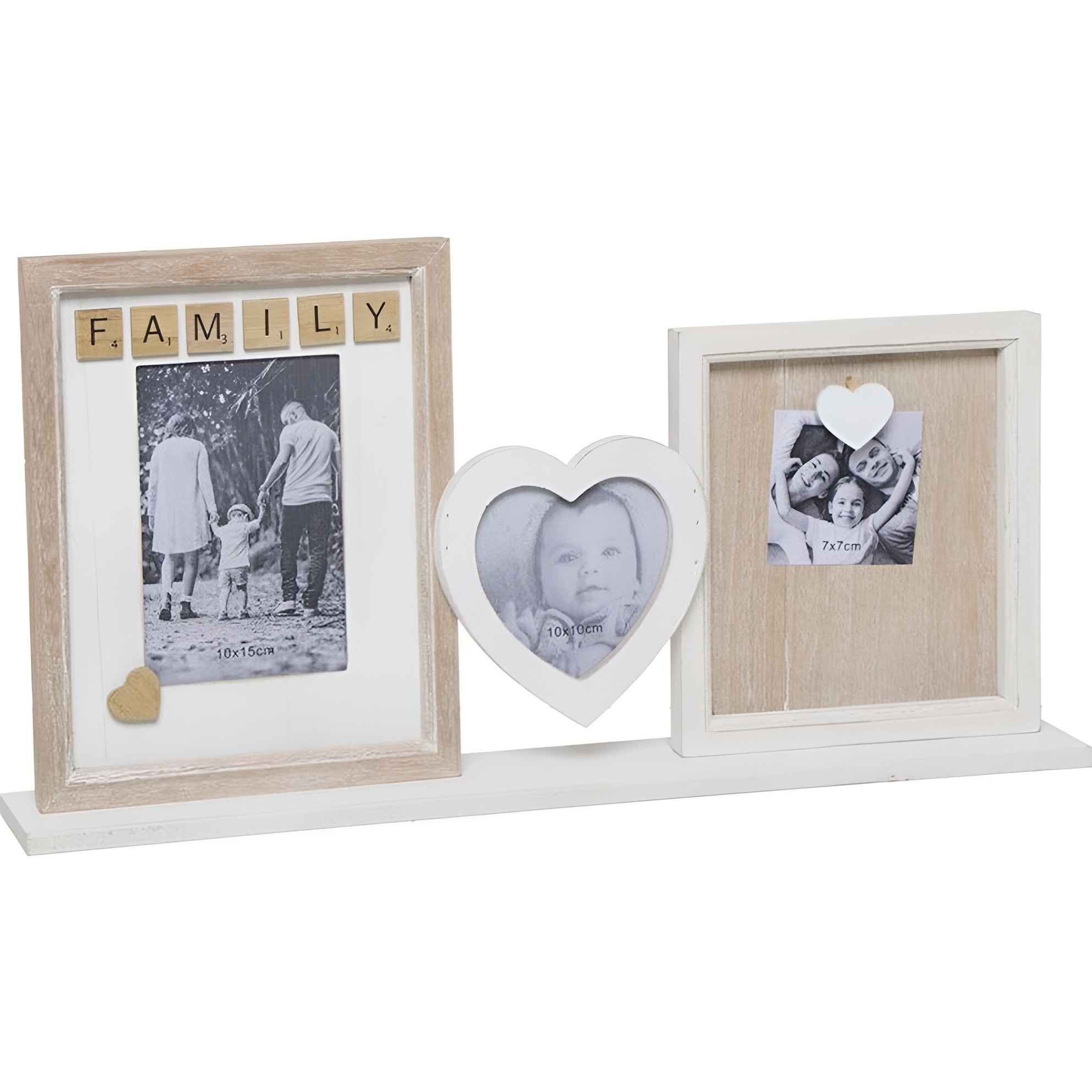 Porta-retratos múltiplo com design familiar que combina letras decorativas e um coração central para realçar as memórias mais queridas.