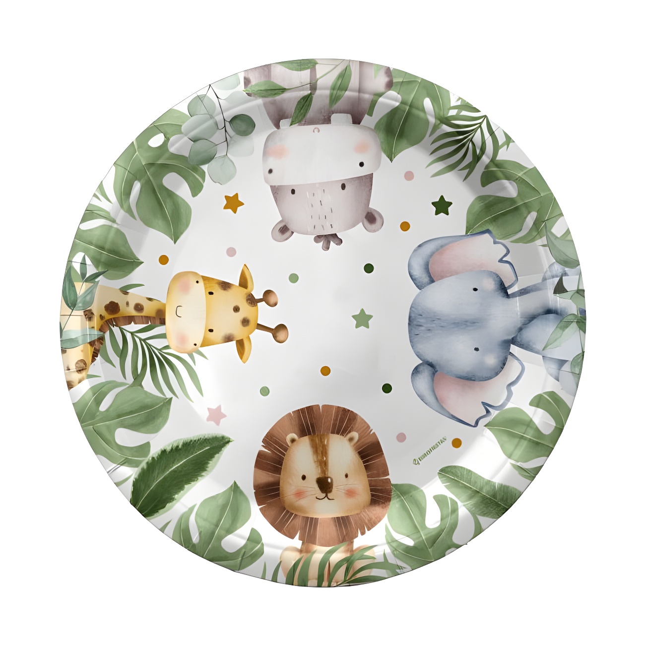 Pratos coloridos em cartão que o senhor/a senhora pode usar para decorar a mesa da sua festa com tema de animais.