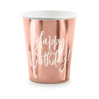 Este produto contém 6 pratos em cor-de-rosa dourado. Cada prato está decorado com a inscrição "Happy Birthday" em branco e estilo tipográfico no centro.