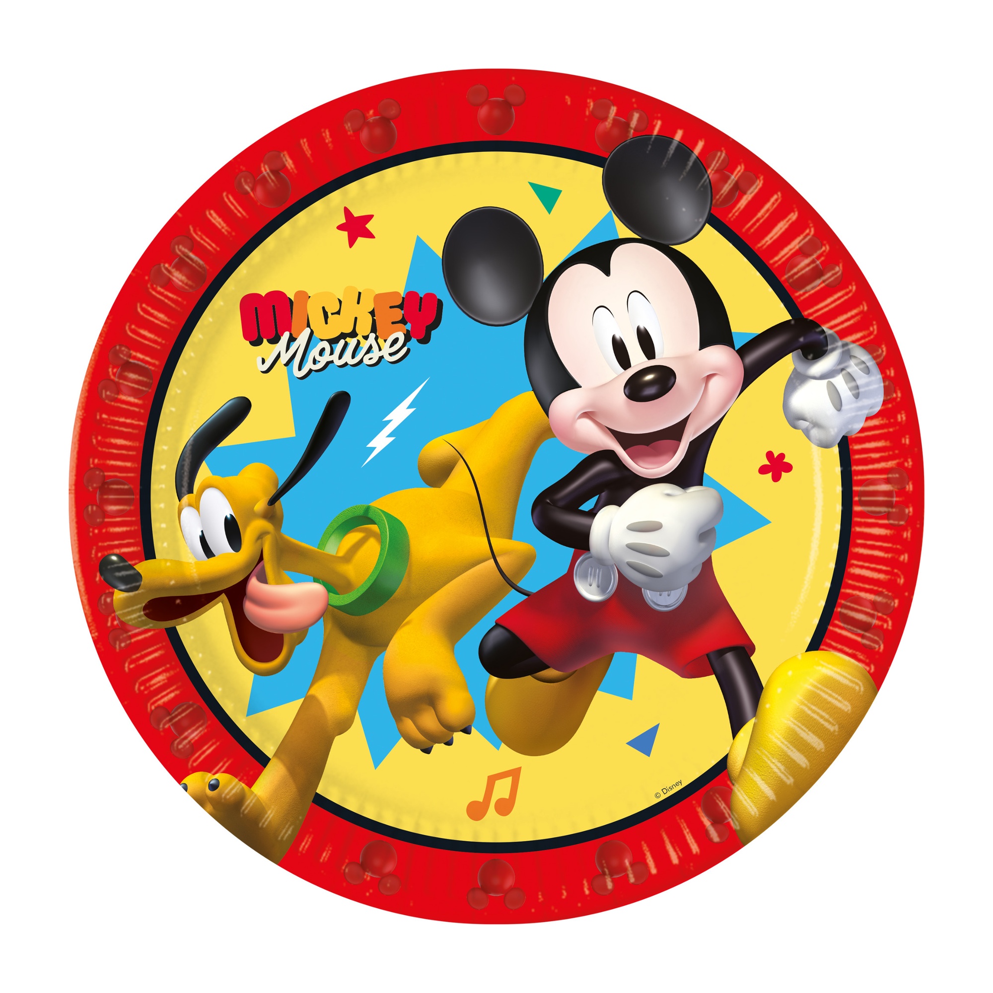 Pratos descartáveis com um desenho apelativo do Mickey Mouse e do Pluto que animam qualquer festa infantil. Cores vivas e pormenores cuidados para combinar com a decoração de aniversário.