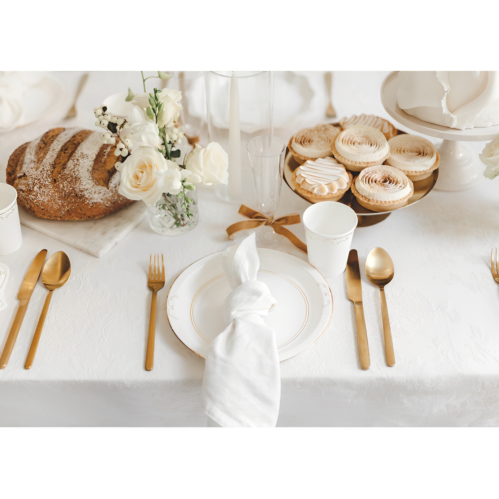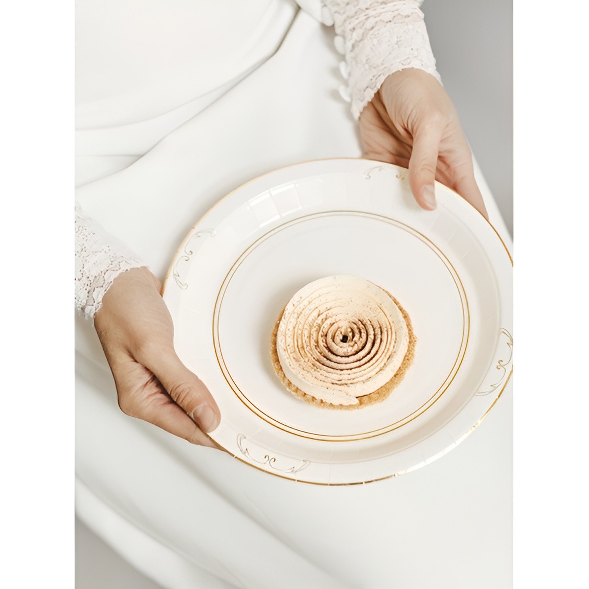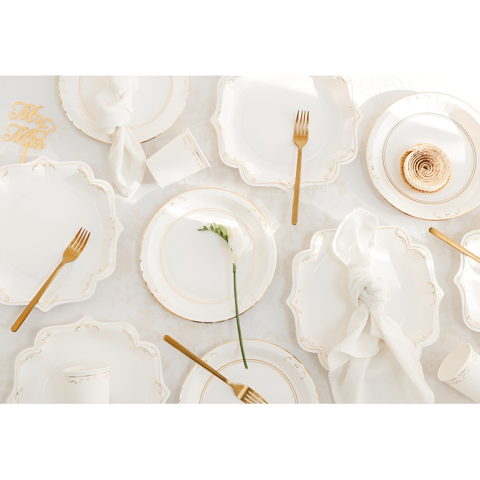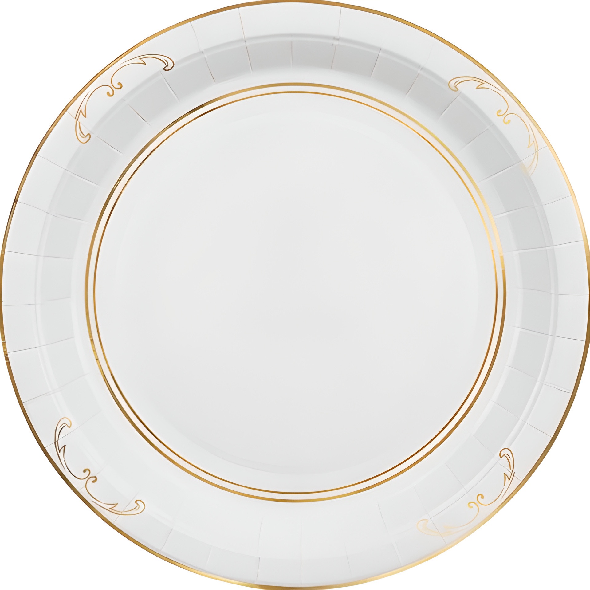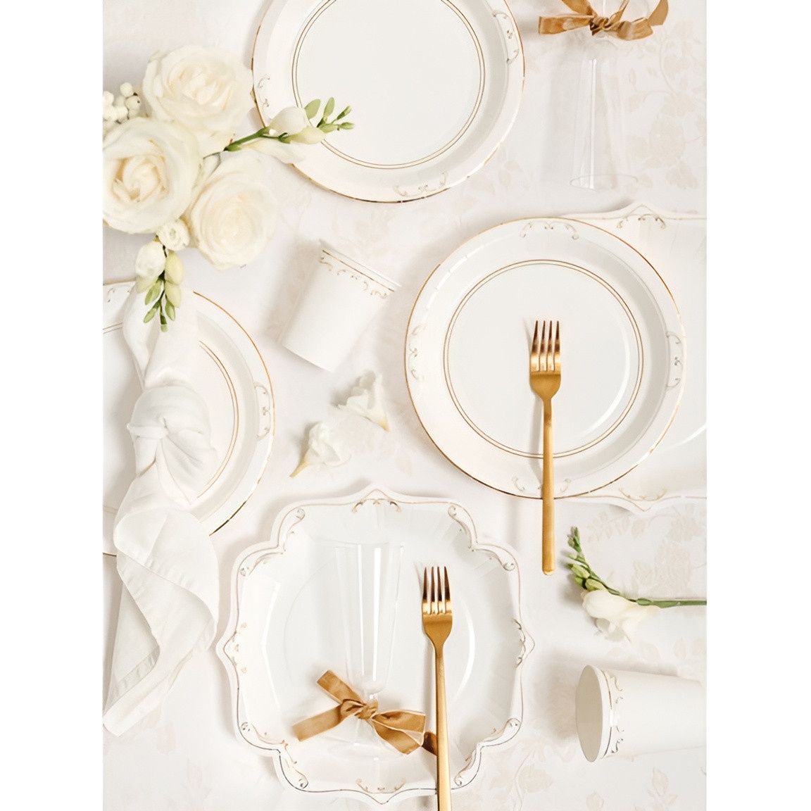 Pratos redondos brancos com um delicado ornamento dourado que confere um toque sofisticado a qualquer mesa. Diâmetro aproximado: 23 cm - concebidos para celebrações e eventos com estilo. Design clássico e neutro que se integra facilmente em diferentes decorações e paletas de cores. Ideais para casamentos, banquetes e recepções em que o(a) senhor(a) procura um acabamento elegante sem complicações.