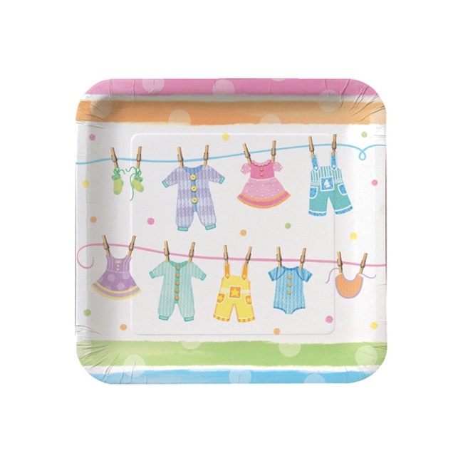 É um pacote de 8 pratos quadrados feitos de cartão laminado com um desenho engraçado de roupas de bebé deitadas na mesa em cores bonitas.