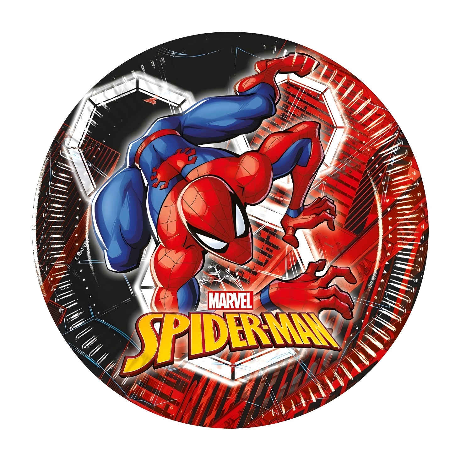 Pratos descartáveis com um atraente design do Spider-Man e motivos de teia que animam qualquer celebração infantil. Pacote com 8 unidades, com diâmetro de 20 cm pensado para porções infantis. Fabricados em papelão com certificação FSC, ideais para servir petiscos e refeições durante a festa.
