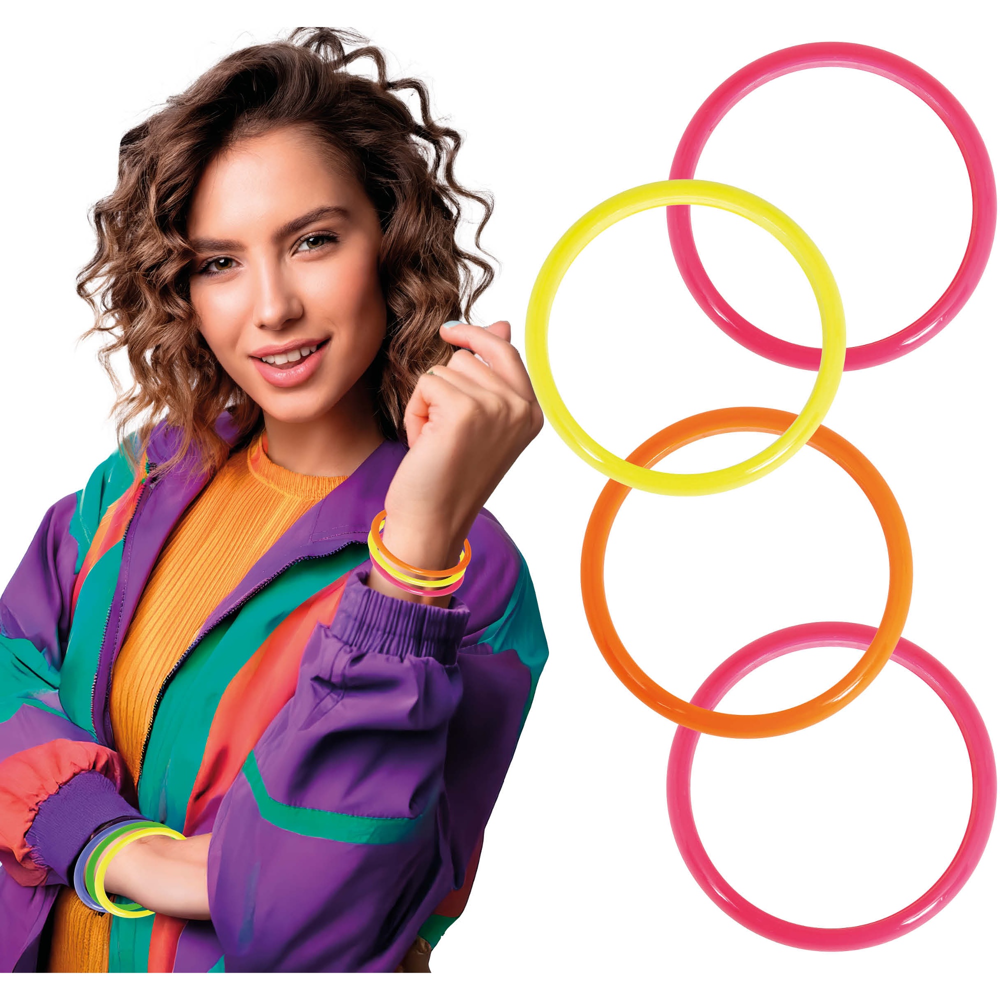 - Conjunto com 4 pulseiras neon em cores sortidas para dar ao seu visual um toque retrô imediato.