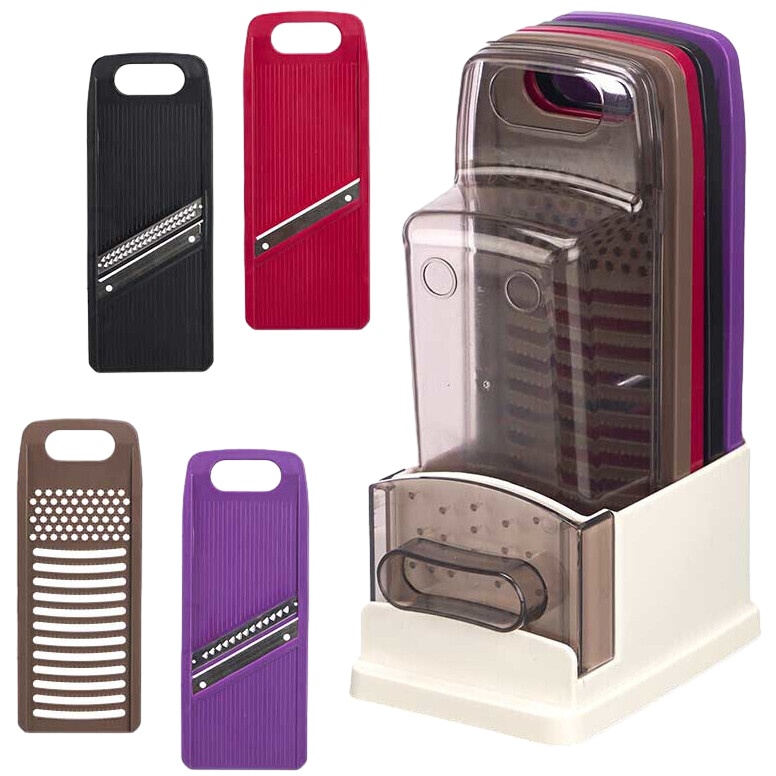 • Inclui vários tipos de raladores e um suporte para mantê-lo organizado.