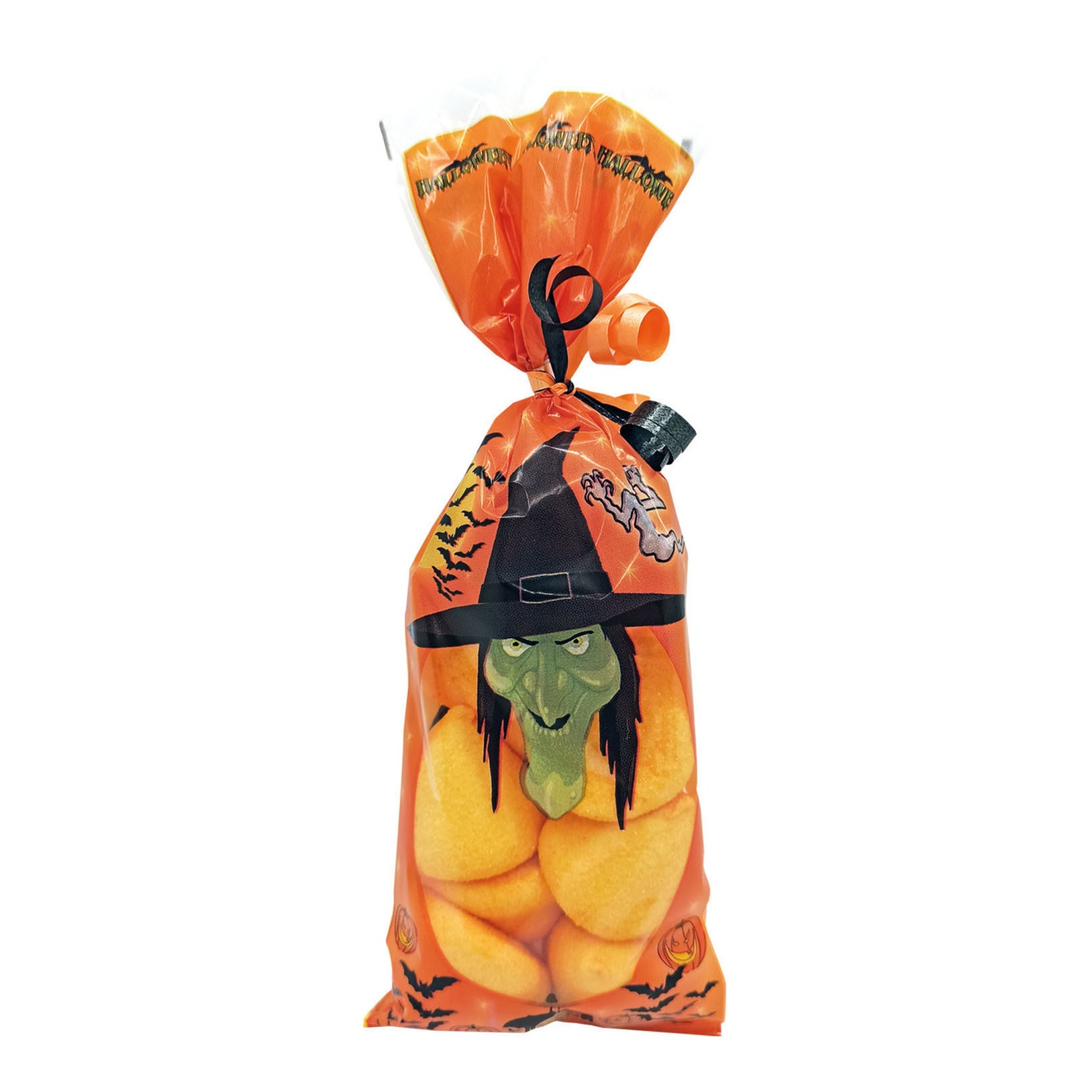 Um saco contendo marshmallows em forma de abóbora que estão dentro de um saco de plástico com uma ilustração de uma bruxa verde.