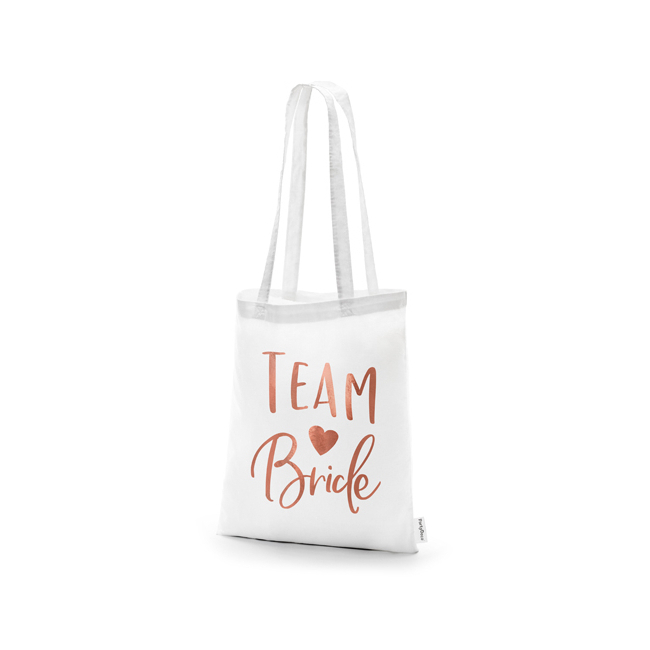 Saco bonito para a equipa da noiva, ideal para a despedida de solteira. Em branco com letras em dourado rosa.