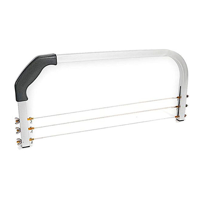 Serra niveladora profissional com 3 fios ondulados que cortam de forma limpa e suave, para um nivelamento perfeito. Fácil de usar, com altura de corte ajustável para escolher a espessura das camadas, e pegas confortáveis.
