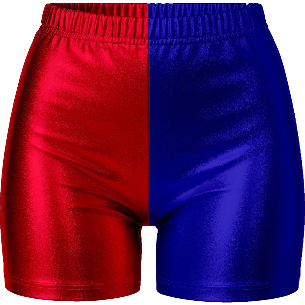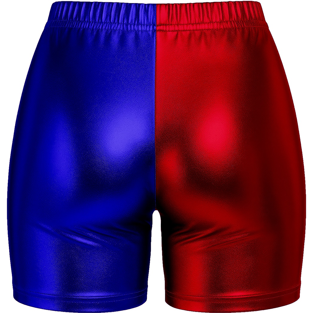 Shorts curtos com acabamento metálico em blocos vermelho e azul, inspirados no icónico estilo de Harley Quinn. Corte ajustado e cintura elástica que proporcionam um ajuste confortável e favorecedor. Tecido de poliéster com brilho acetinado que sobressai em festas, cosplay e sessões fotográficas. Perfeitos para que o senhor/a senhora combine com tops e acessórios temáticos e crie um conjunto marcante para o Carnaval e eventos de fantasia.