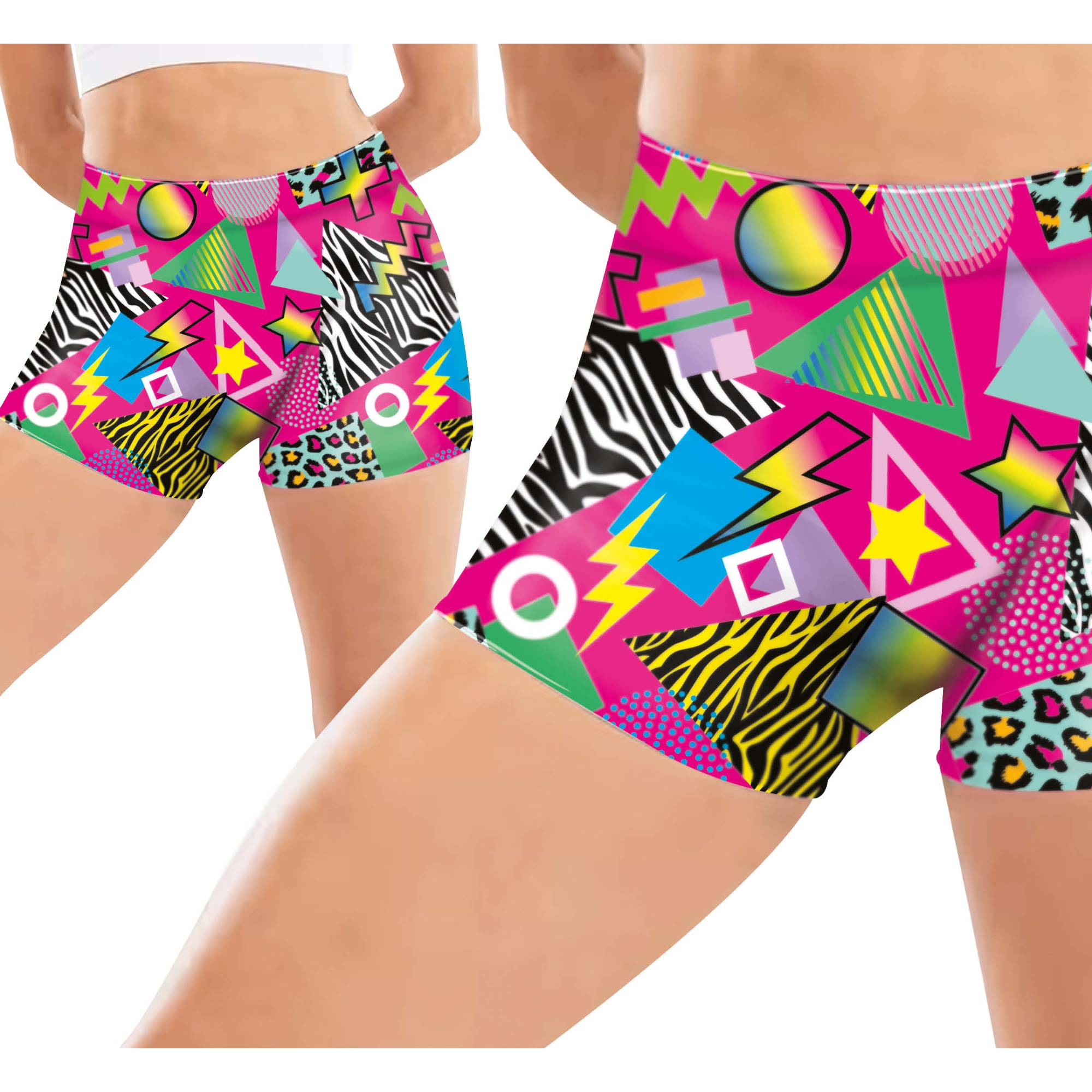 Shorts elásticos com vibrante estampa retrô em tons neon, inspirados na estética dos anos 80. O corte justo e o cós largo proporcionam um ajuste confortável e favorecedor, perfeito para que o senhor/a senhora use em treinos, dança, festivais ou festas temáticas. Tecido de poliéster elástico que oferece liberdade de movimento e secagem rápida. Confere um toque arrojado e colorido ao guarda-roupa do senhor/a senhora, ideal para looks chamativos e cheios de energia.