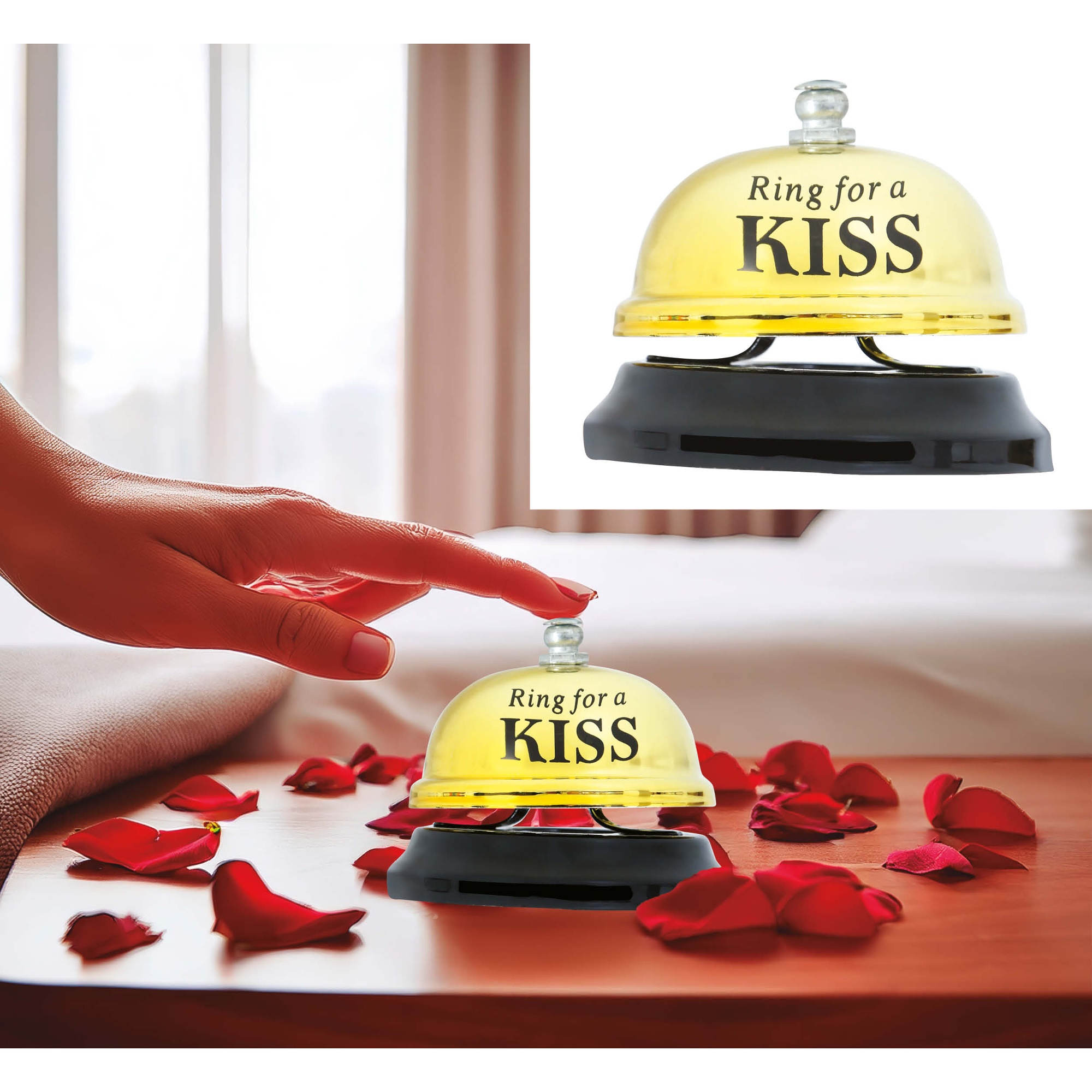 Pequeno sino de mesa com a mensagem divertida "Ring for a KISS", pensado para criar momentos românticos e surpresas entre casais. A campainha metálica produz um som claro e reconhecível ao ser pressionada, perfeito para chamar a atenção de forma carinhosa. É um presente original para aniversários, escapadas românticas ou jantares íntimos. Fácil de usar e com um design encantador que decora qualquer mesa de cabeceira ou bandeja.