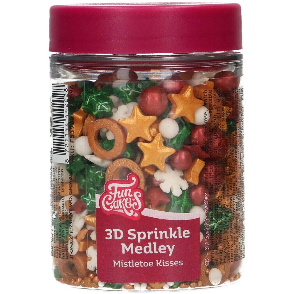 - A mistura de decorações inclui figuras em 3D (estrelas, flocos de neve, folhas de visco e círculos), pérolas, nonpareils, fichas planas e estrelas.