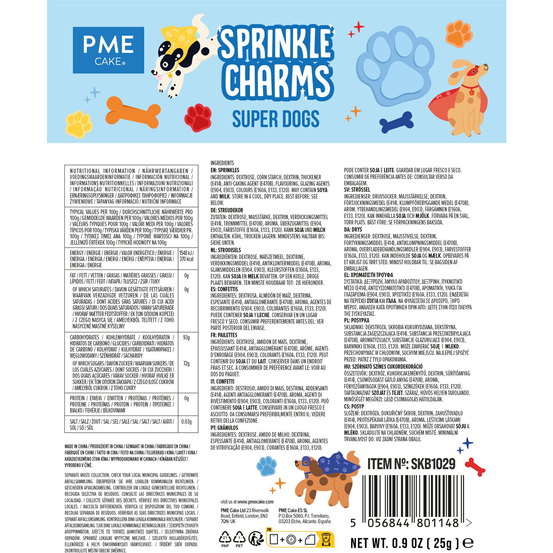 Ingredientes: dextrose, amido de milho, dextrina, espessante (E414), antiaglomerante (E470B), aroma, agentes de revestimento (E904, E903), corantes (E160A, E133, E120).