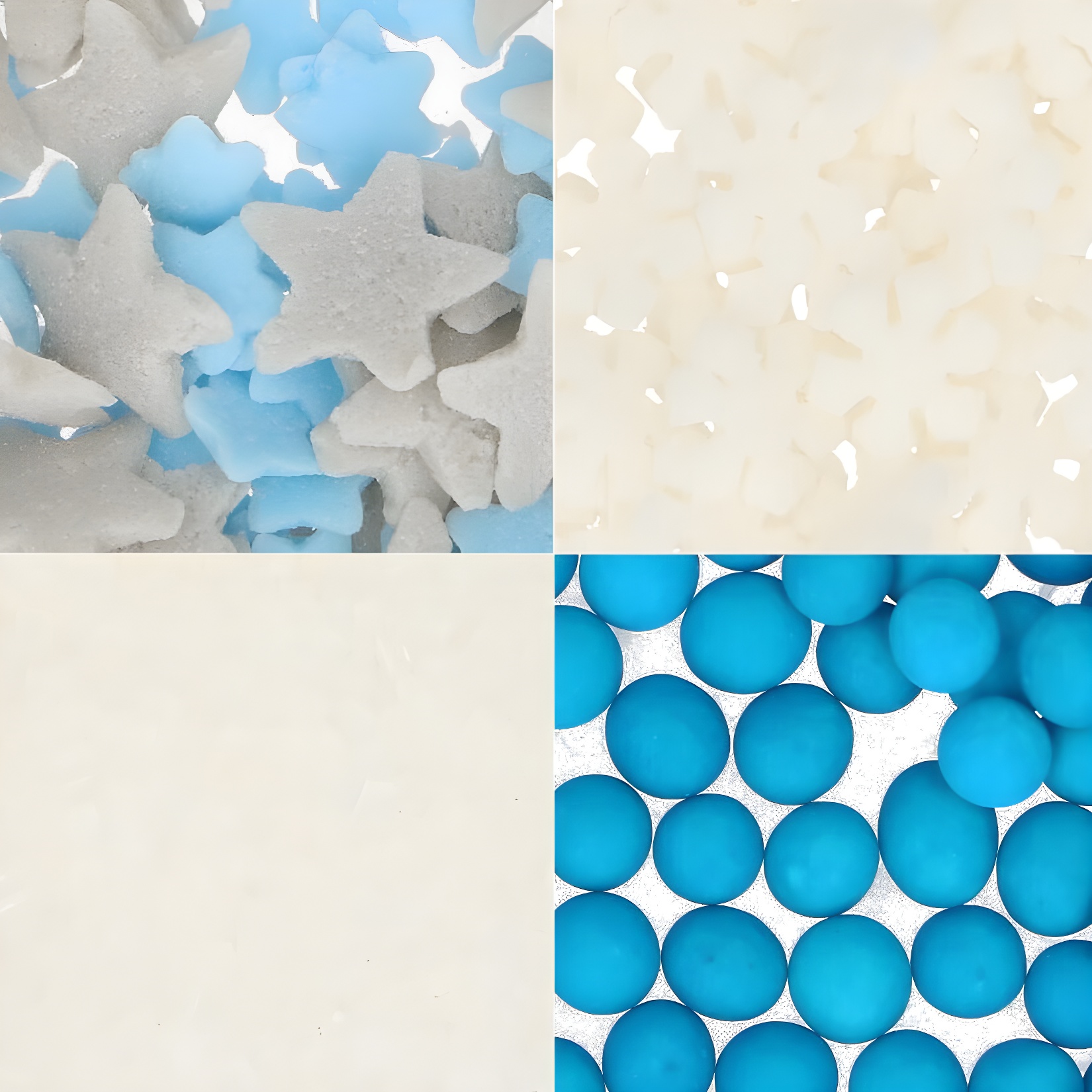 - Cristais de açúcar brancos, flocos de neve brancos, estrelas azuis e prateadas, pérolas azuis.