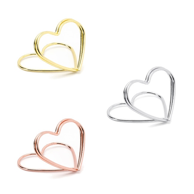 Têm um aspeto metálico. Quando se coloca o cartão à frente, a forma de coração mantém-se no lugar e dá um toque encantador para completar a mesa em qualquer evento.