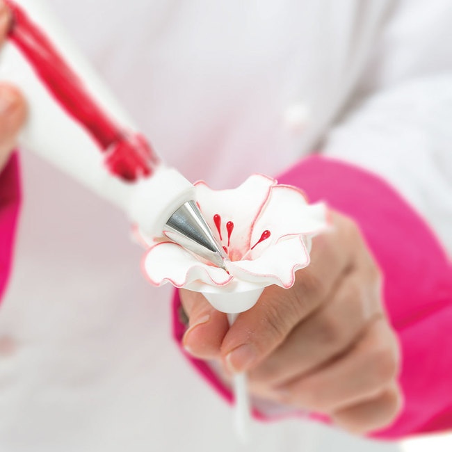 Suporte para fazer flores em forma de cálice em glacé real. O pé insere-se facilmente na base e permite-lhe rodá-lo com uma mão enquanto manuseia o saco de pasteleiro com a outra.
