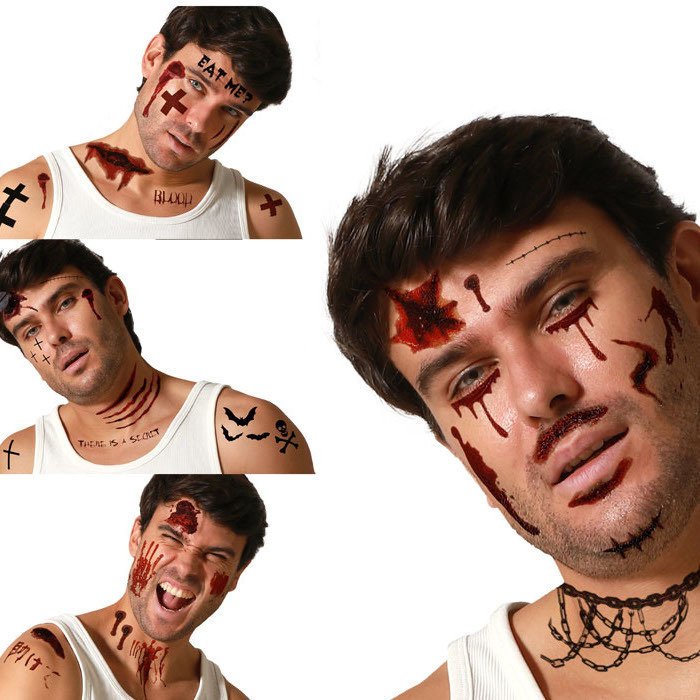 - Conjunto de tatuagens temporárias que incluem cortes sangrentos, pontos de sutura e arranhões. Ideal para fantasias de monstro ou vítima de horror. Existem 4 designs possíveis.