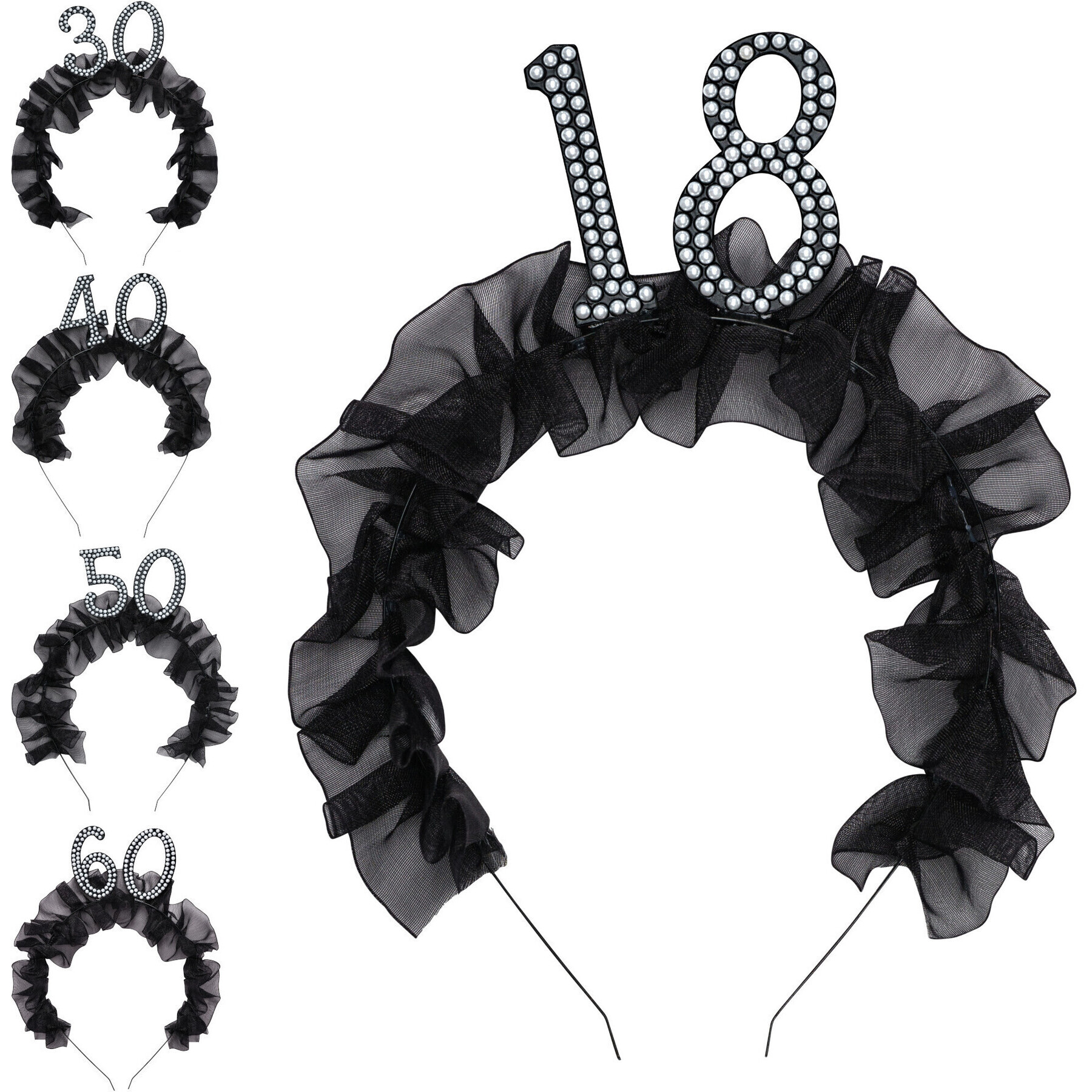 - Tiara com volante de tecido preto e o número 18 decorado com pérolas.