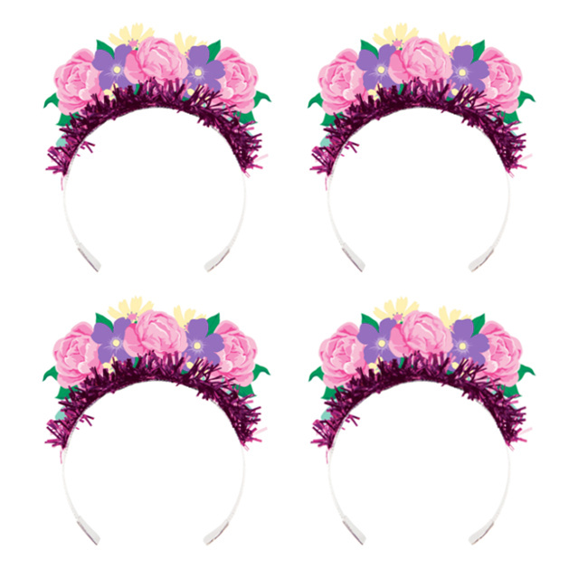 Este saco contém 4 tiaras de elástico prateadas, com uma tira de lumaline com franjas de cor fúcsia no exterior, e recortes de cartão com decorações florais colados às tiaras.