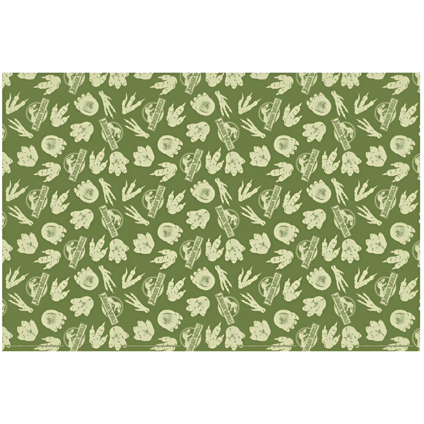 - Design oficial Jurassic World com motivos de dinossauros e pegadas em tons de verde.