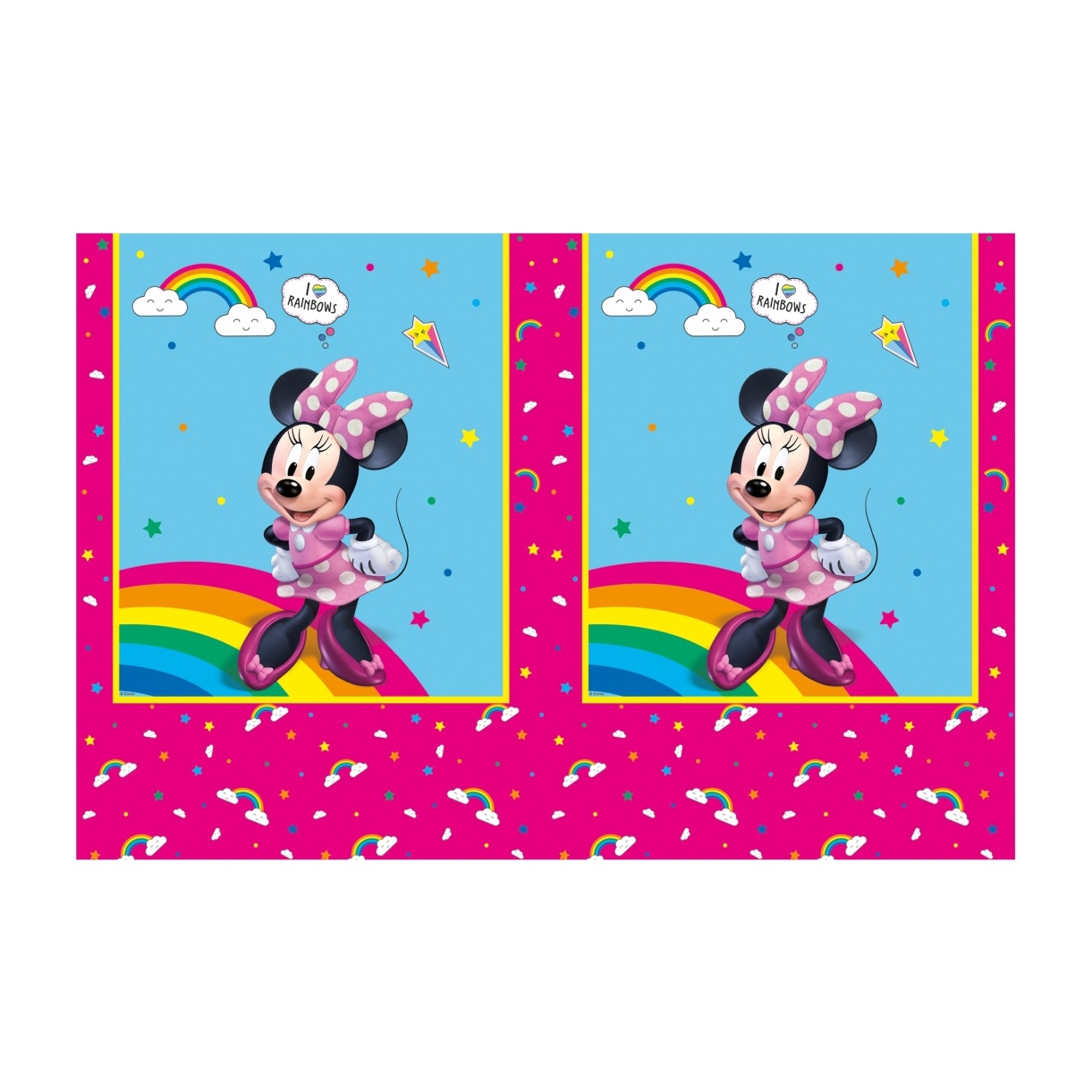 Toalha decorativa com o icónico design da Minnie Mouse e arco-íris, que acrescenta cor e diversão às mesas infantis.