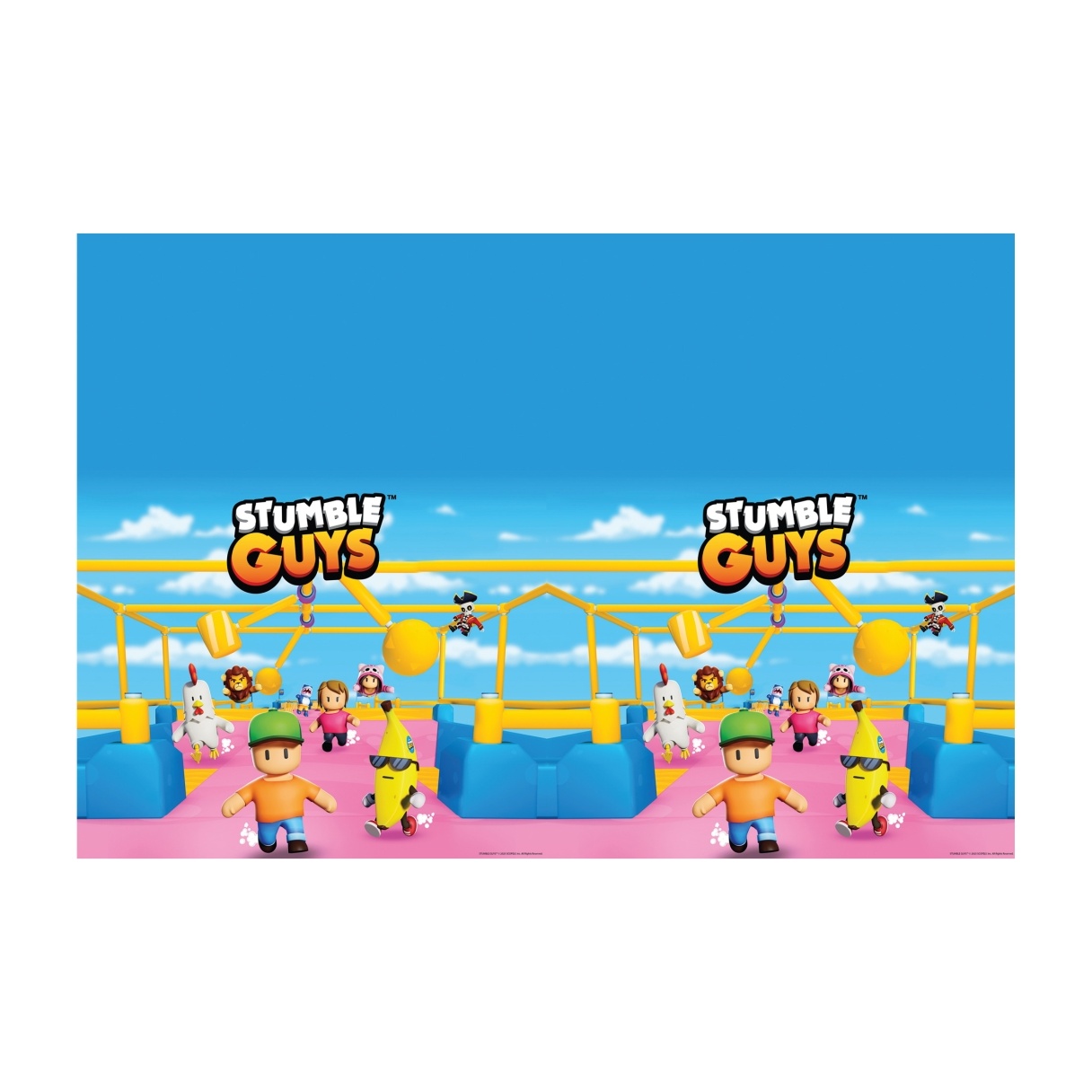 Toalha de mesa de plástico com estampa do Stumble Guys, pensada para que o senhor/a senhora anime as mesas infantis. Apresenta cores vibrantes e personagens reconhecíveis que criam um ambiente divertido e dinâmico. Seu tamanho amplo cobre mesas padrão e facilita a decoração rápida da mesa principal. Design marcante, ideal para aniversários e celebrações infantis.