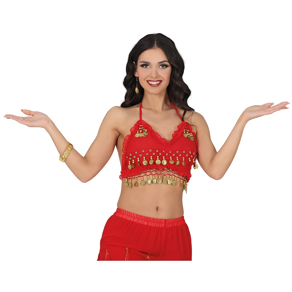Top vermelho no estilo dança do ventre, com adornos de moedas douradas que proporcionam brilho e movimento. Design curto e feminino pensado para apresentações, aulas e festas temáticas. Alças finas que valorizam o decote e permitem liberdade de movimentos para as suas coreografias. Perfeito para acrescentar um toque exótico ao seu figurino de Carnaval ou espetáculo.