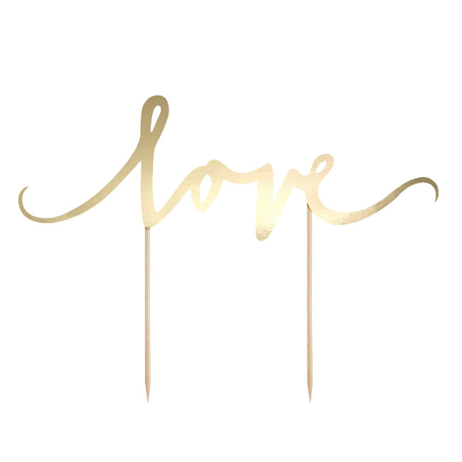 Peça decorativa formada pela palavra love em cor dourada e dois espetos que ajudarão a incorporar o produto no bolo ou noutra base.
