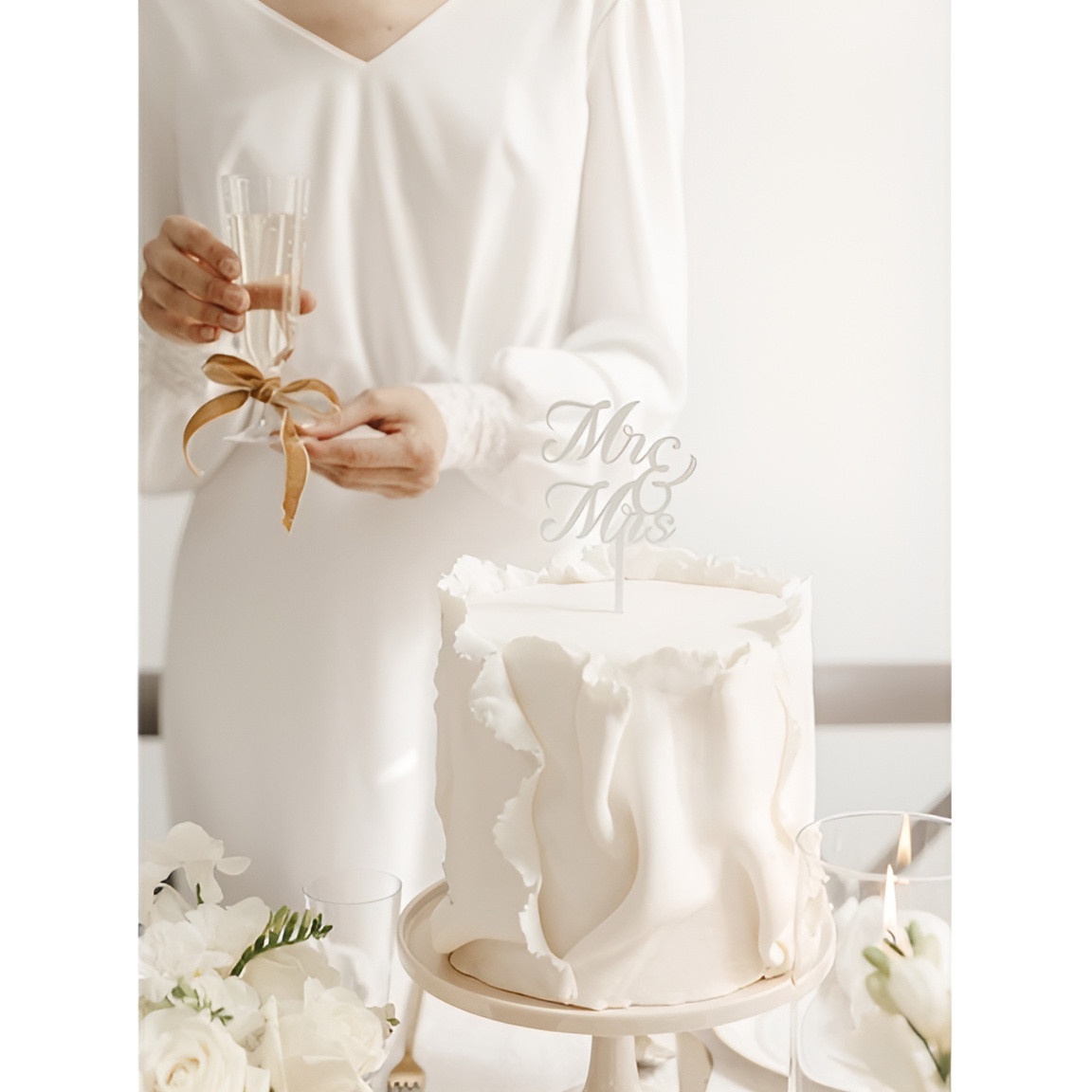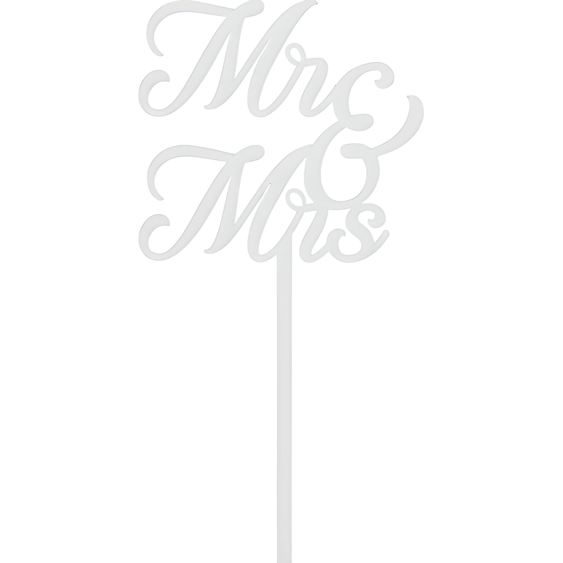 Topper de bolo MR & MRS em acrílico branco que acrescenta um toque elegante e romântico à decoração nupcial. O seu design caligráfico e acabamento polido valorizam qualquer bolo, criando um ponto focal sofisticado.
