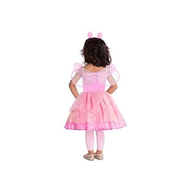 Esta versão de conto de fadas do fato da Peppa Pig é perfeita para fazer magia. O vestido tem um corpete com estampado da Peppa Pig, mangas de tule, um cinto de flores e uma adorável saia estampada em camadas. Inclui também um par de asas transparentes com armação de arame e velcro para fixar na parte de trás e uma bandolete com orelhas cor-de-rosa muito bonitas.