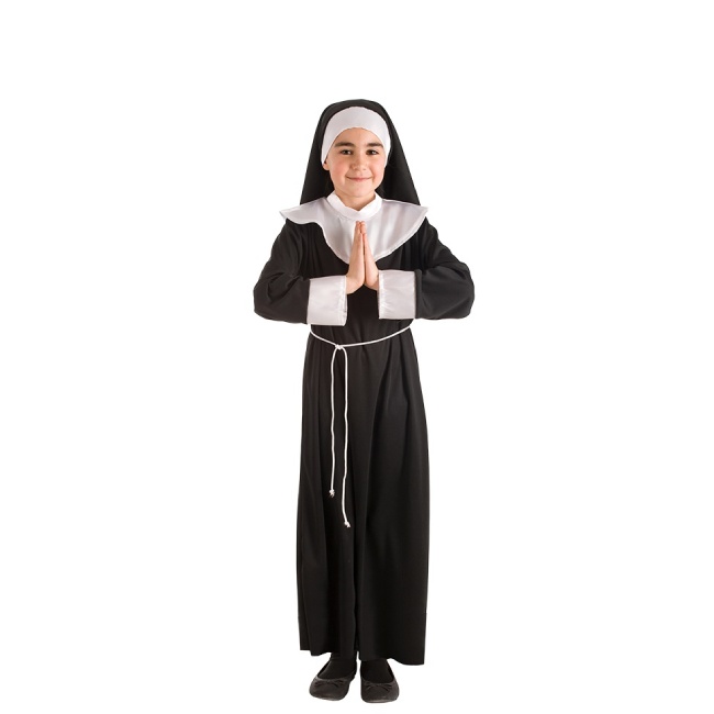 Esta fantasia inclui um toucado preto com fita branca, semelhante aos usados pelas freiras, juntamente com um colarinho branco largo. É complementado por um vestido com mangas compridas e saia em preto, com punhos brancos. Pode ser facilmente ajustado com um laço branco, também incluído.