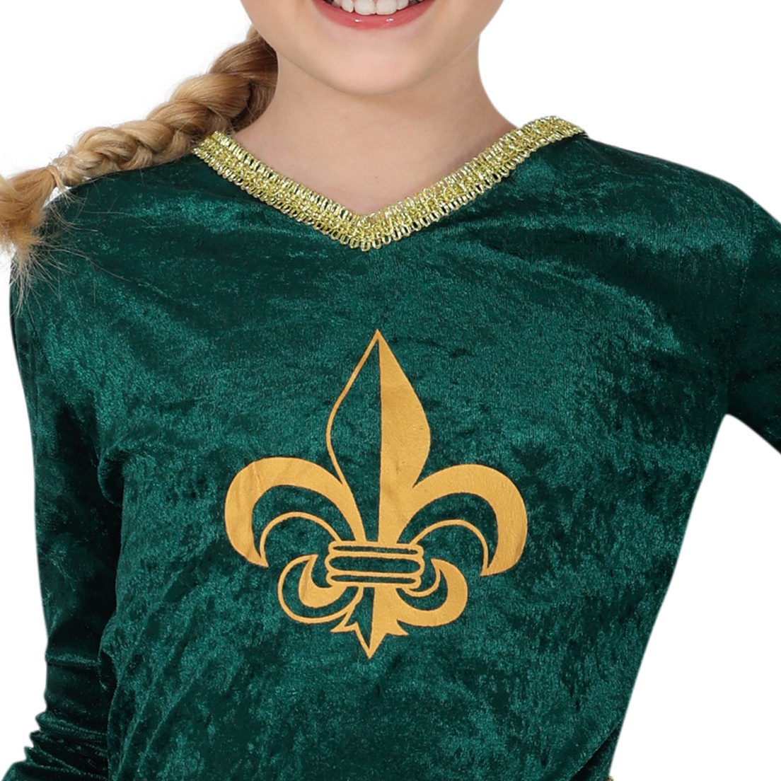 Possui detalhes em dourado como a insígnia da flor de lis gravada no peito e as bordaduras douradas que contornam o traje, dando-lhe um toque elegante. Para que a cintura fique mais ajustada e conseguir uma bonita figura, tem nas laterais duas fitas para amarrar atrás. Pode completar o modelo com esta linda coroa dourada acabada em picos.