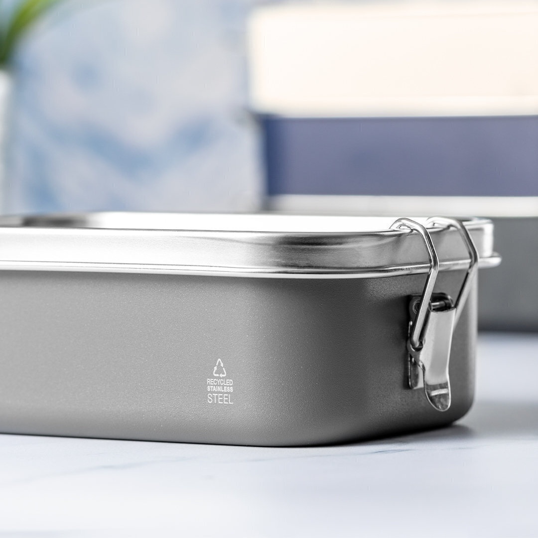 - Tampa hermética com fechos de segurança e distintivo de aço inoxidável reciclado.