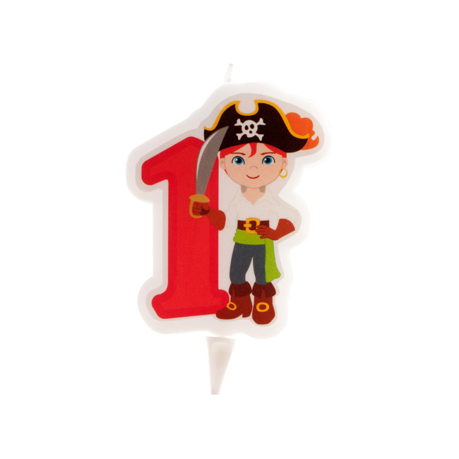 Esta vela apresenta a silhueta e o desenho de um pirata em muitas variações. Foi recriado num estilo de desenho animado e aparece ao lado de um número vermelho.