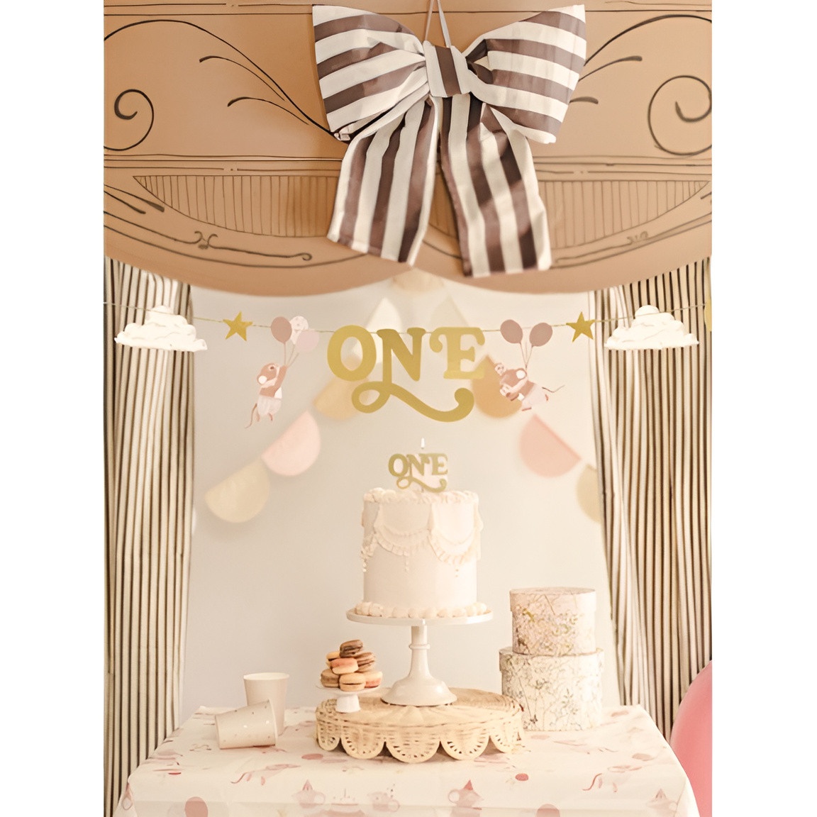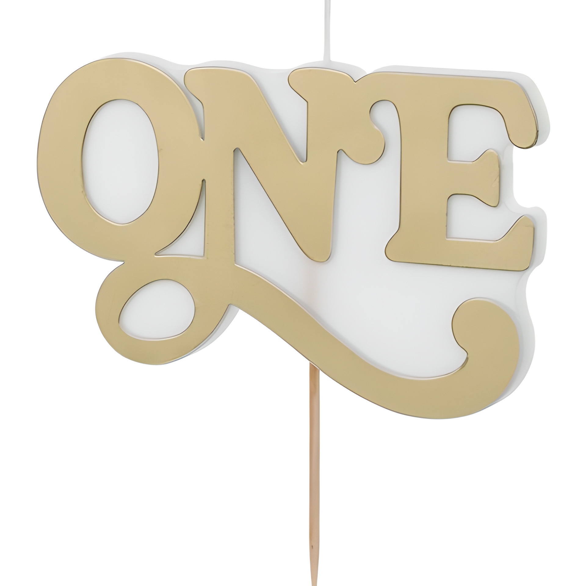 ONE em acabamento em ouro frio para um toque elegante no bolo do primeiro aniversário. Design marcante e legível que se destaca em fotos e celebrações. Colocação simples graças ao espeto integrado. Confere um acabamento festivo e sofisticado a qualquer decoração de aniversário.
