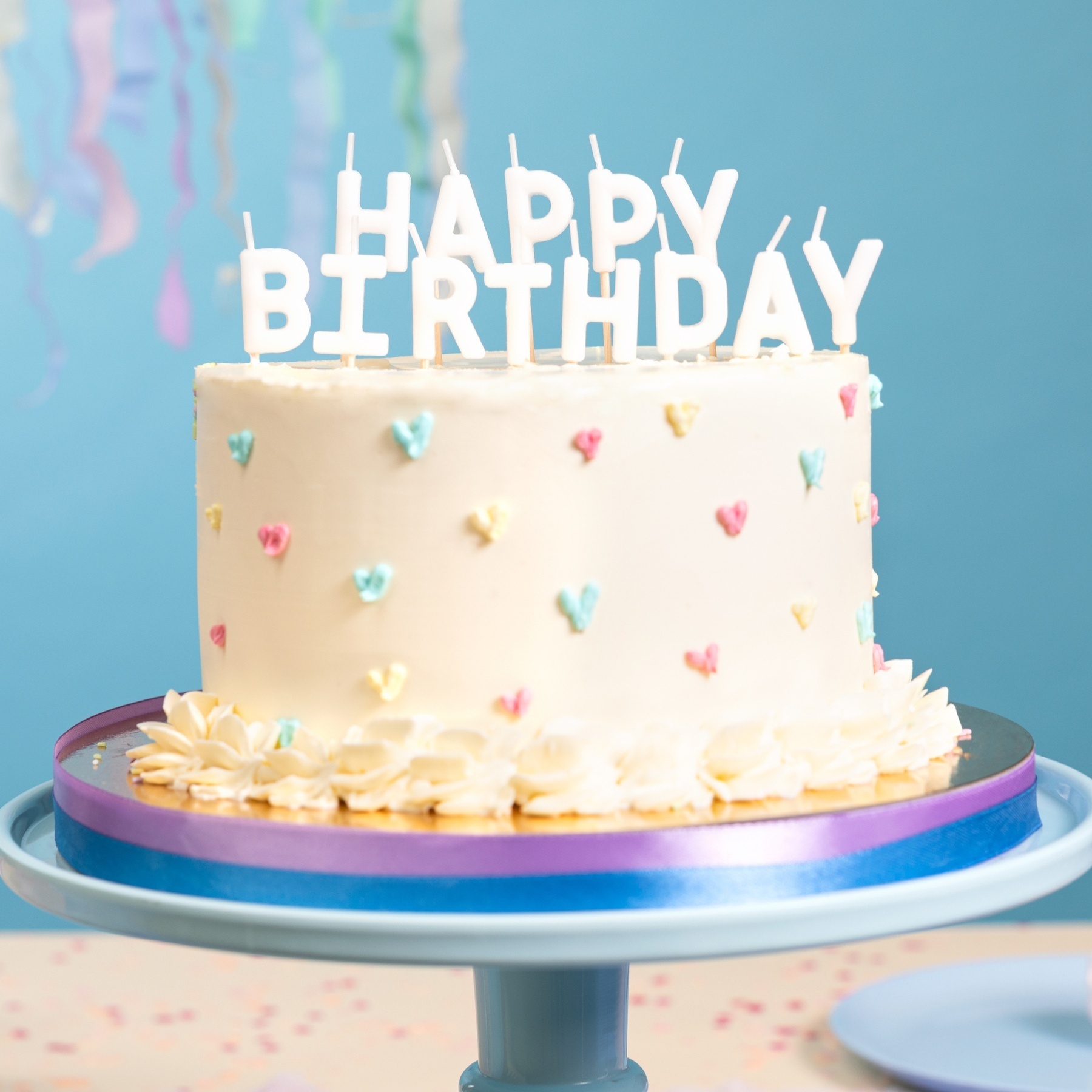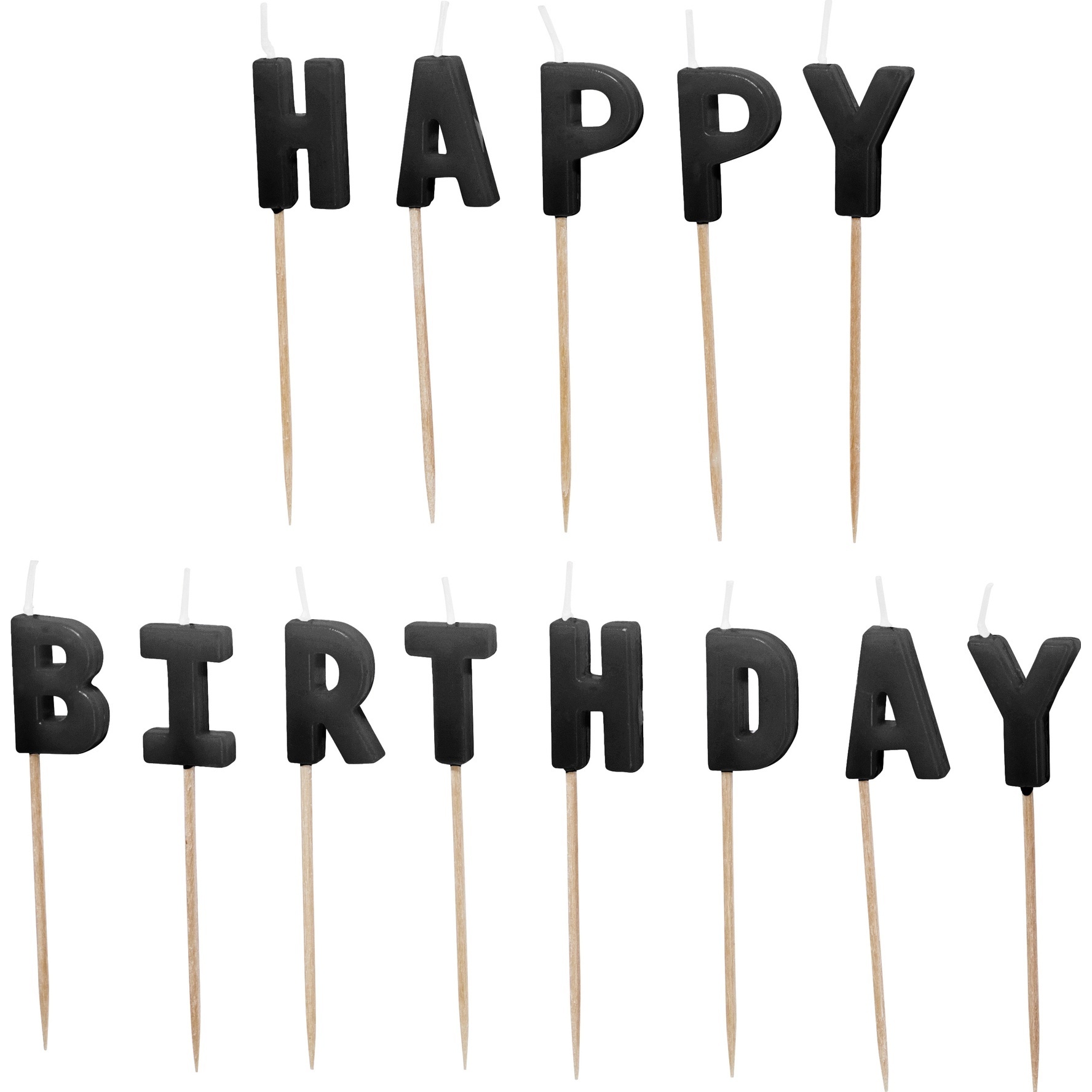Conjunto de velas com as quais se pode formar a frase HAPPY BIRTHDAY, imprescindível em qualquer aniversário.